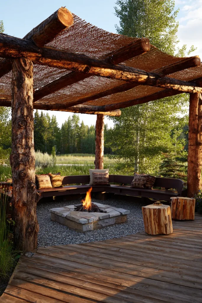 Chunky wooden posts and a woven canopy create this cozy pergola around a firepit. The rustic charm feels straight out of a mountain retreat, perfect for cool nights and good company.