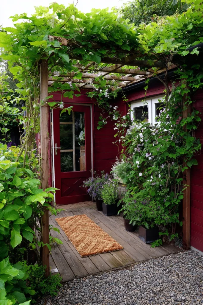 This small pergola frames a charming walkway beside a red cottage wall, surrounded by climbing vines and lush greenery. The wooden trellis roof gives just enough coverage to make it feel secluded but airy.