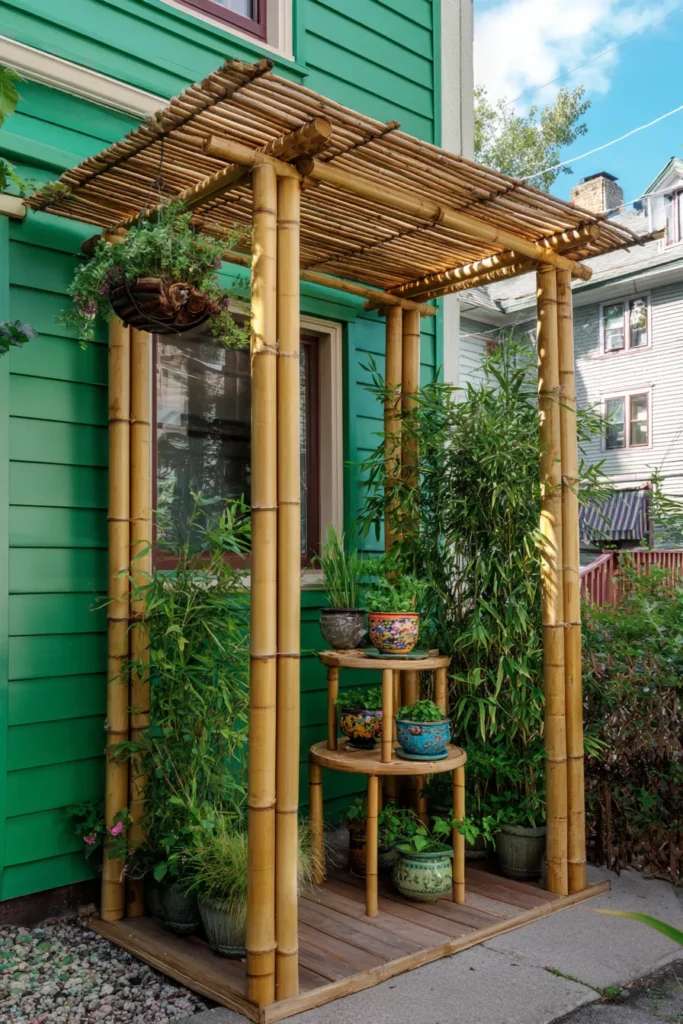 This petite bamboo pergola feels like a hidden nook straight out of a tropical hideaway. The natural canes and layered greenery give it a breezy, eco-chic vibe that’s perfect for tiny patios or narrow side yards. Its open slats let in soft light while still offering privacy and shade.