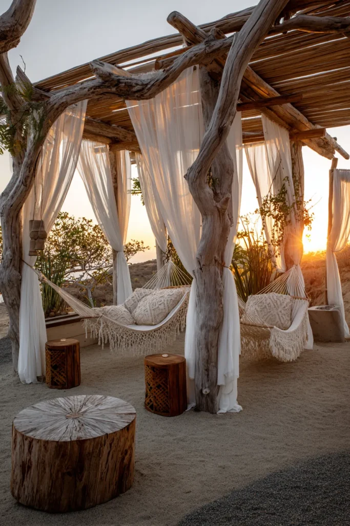 I can almost hear the wind swaying those hammocks. It’s so effortlessly romantic and cozy that I’d probably lose track of time lounging here with a book or a cup of tea. The whole setup screams laid-back luxury.