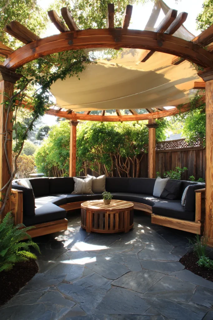 This rounded pergola design wraps seating around a cozy center table, creating an intimate space for chatting or sipping coffee outdoors. The rich wooden tones and surrounding greenery add a grounded, organic touch that feels both modern and timeless.