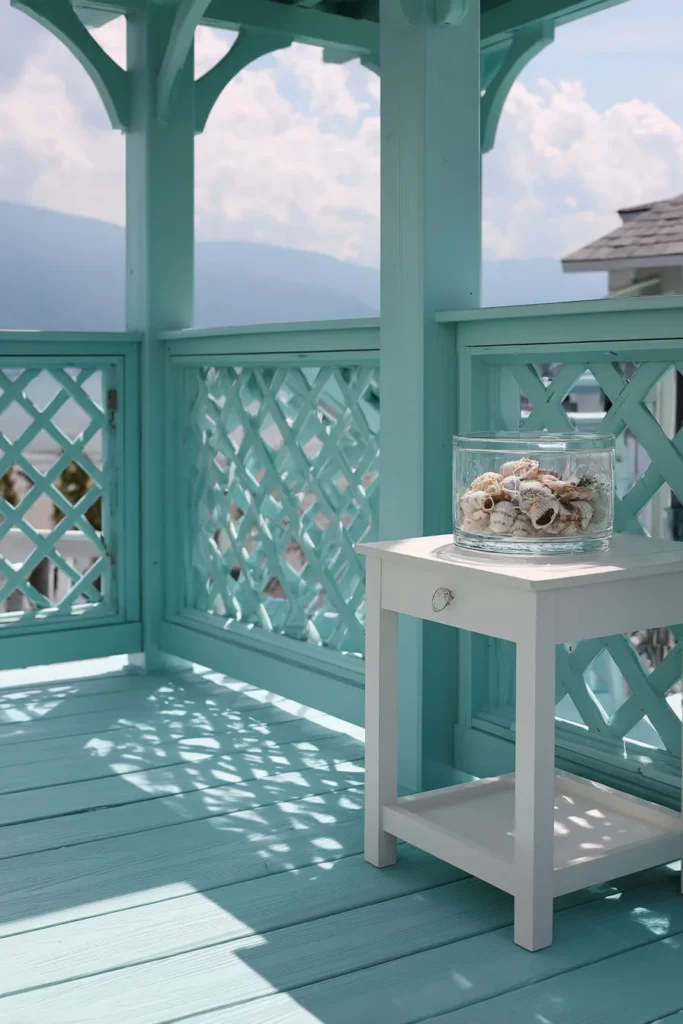 This pastel-painted corner pergola is such a charming surprise. Its soft mint hue, decorative railings, and airy light make it ideal for small balconies or sunny terraces. It’s dainty yet bright, instantly refreshing any tight outdoor space.