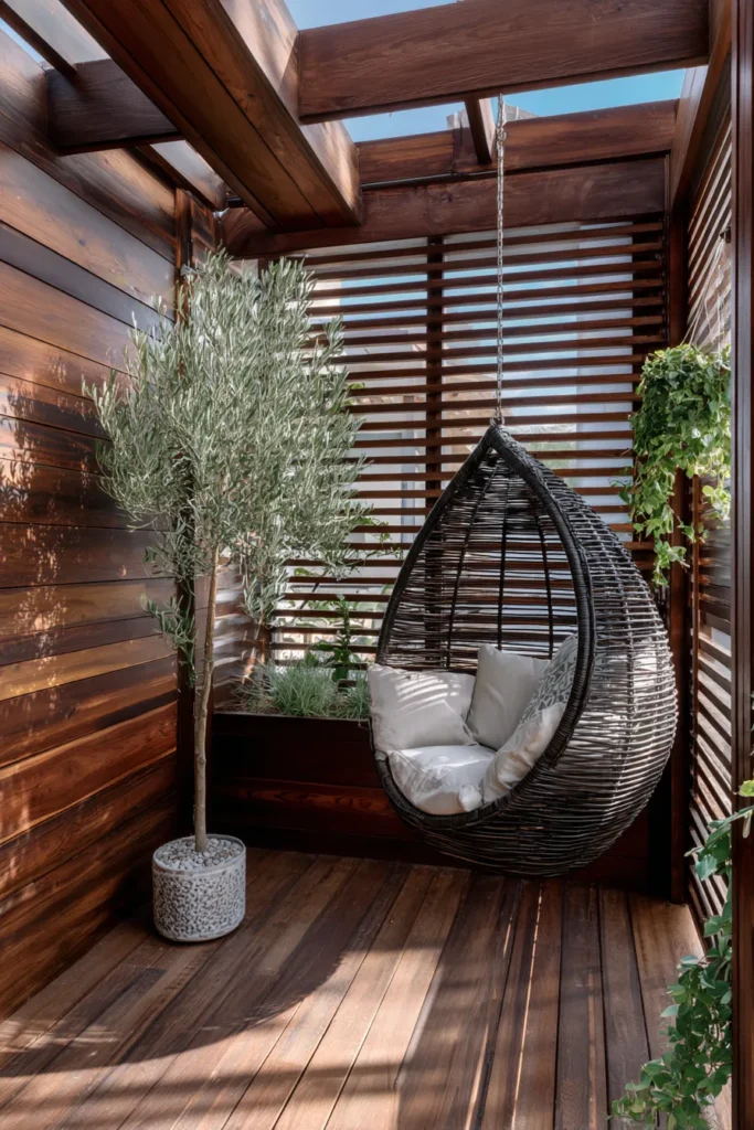 Sleek wooden slats and a hanging egg chair turn this small pergola into a private escape pod. The contrast of dark wood with leafy greens adds a touch of modern sophistication, perfect for urban backyards or tight courtyards.