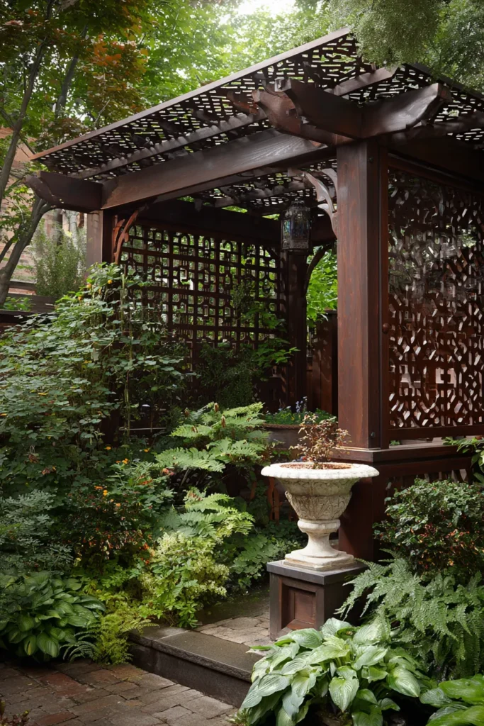 With its carved lattice panels and serene greenery, this design channels the peaceful essence of a Japanese garden. The combination of stone planters, subtle shadows, and lush foliage makes it feel calm and timeless.