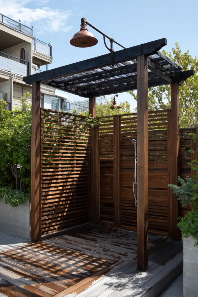 This compact wooden pergola blends seamlessly into modern city life. Its vertical slats offer privacy without closing off airflow, while the slim frame keeps things light and open. It’s minimal, functional, and surprisingly cozy.
