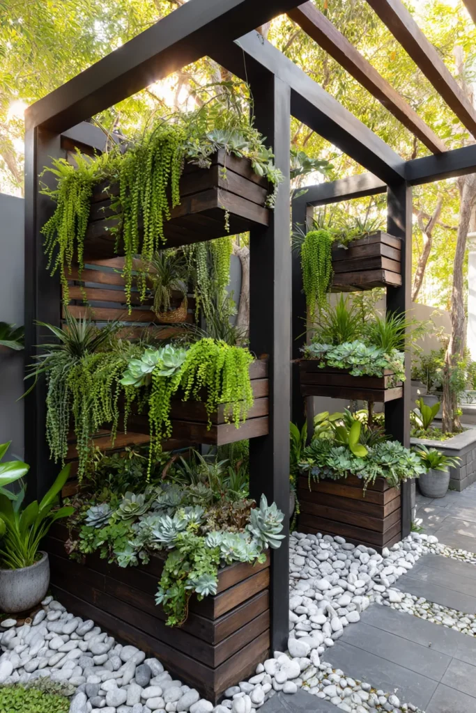 This corner pergola takes full advantage of height, stacking greenery in layered planters that bring nature right into tight spots. The black frame makes the greens pop, creating a lush, contemporary look.
