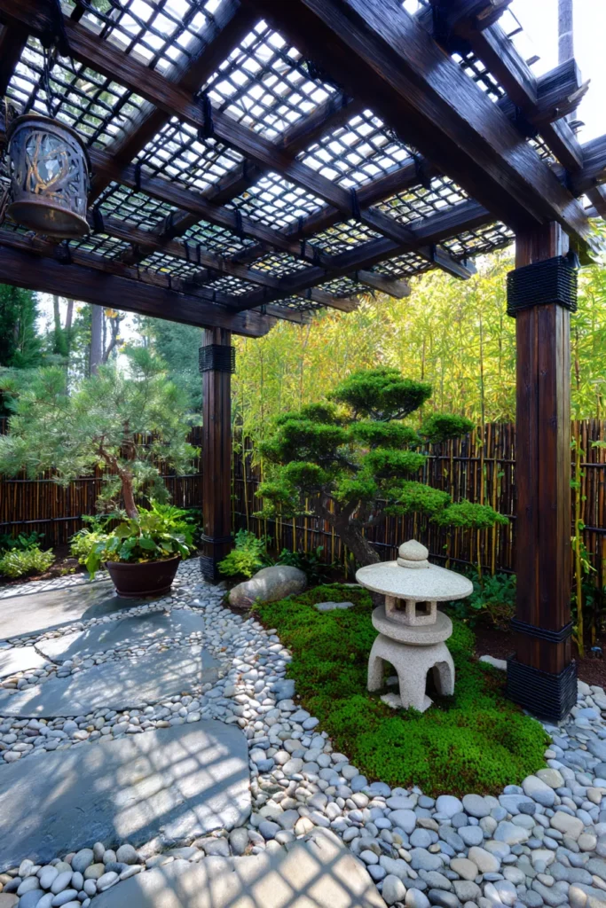 This pergola brings total peace with its serene garden stones, soft greenery, and a classic Japanese lantern centerpiece. The wooden lattice roof filters sunlight beautifully, creating dappled shadows that dance over the pebble floor.
