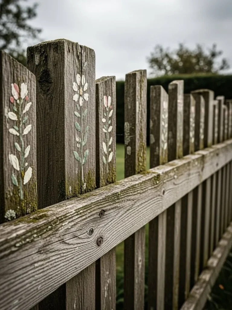 This fence features weathered wooden slats decorated with delicate hand painted floral motifs that feel soft and charming. The gentle colors and slightly faded finish give it a well loved look that feels collected over time rather than newly installed. The uneven grain in the wood and the relaxed spacing between the boards add to that cozy cottagecore feeling.