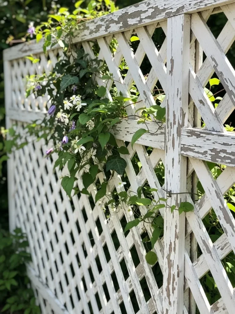 This white lattice fence adds texture and softness with climbing plants weaving through the open pattern. The paint looks slightly weathered which keeps it from feeling too crisp. Leaves and vines soften the structure and blur the line between fence and garden.