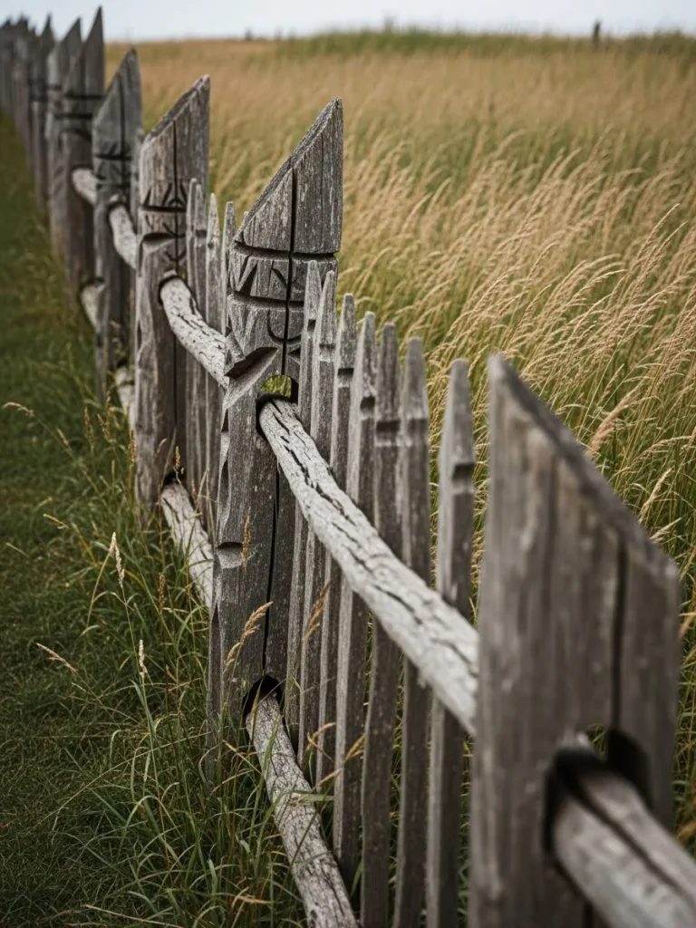 A rustic fence stretches through tall grass with uneven boards and a gray washed finish. The wood looks naturally aged by sun and wind. Nothing feels polished which adds to its quiet countryside charm.