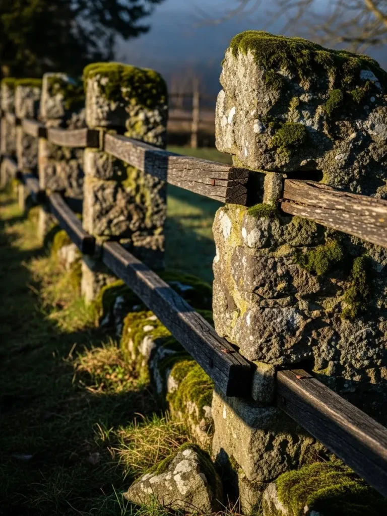 Rough stone posts topped with a simple wooden rail create a fence full of texture and age. Moss clings to the stone and softens every edge. The mix of materials makes it feel sturdy yet gentle.
