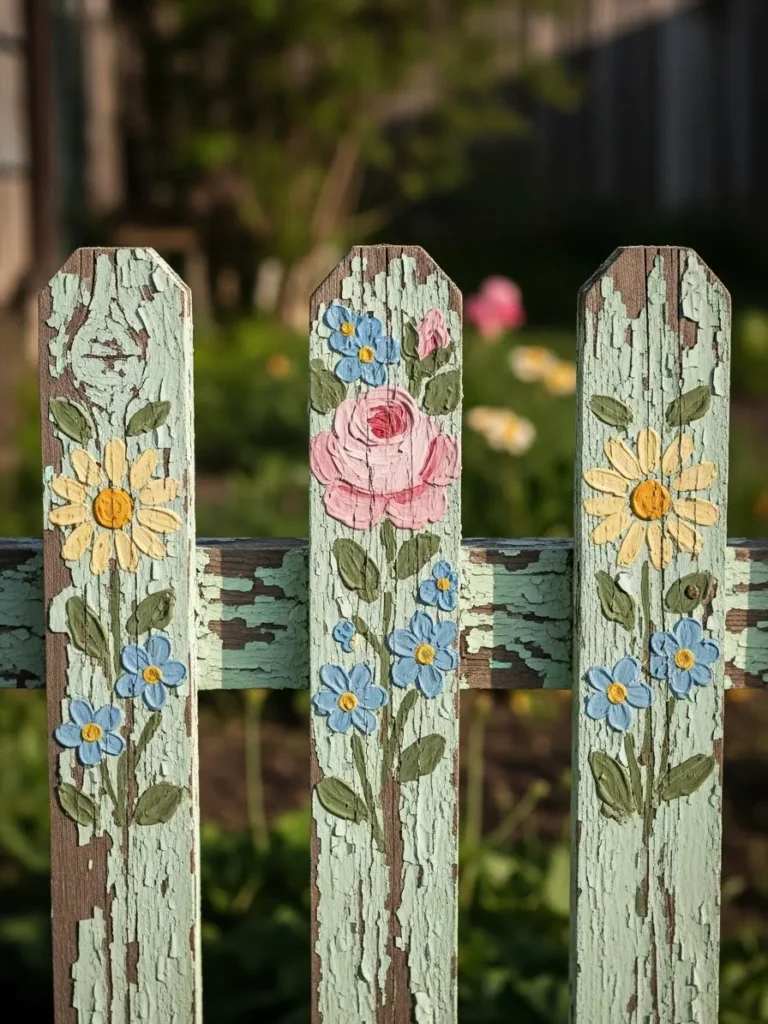 A row of pale wooden pickets is decorated with hand painted flowers in soft cheerful colors. The paint looks lightly weathered which adds charm rather than perfection. Each board feels unique and personal.