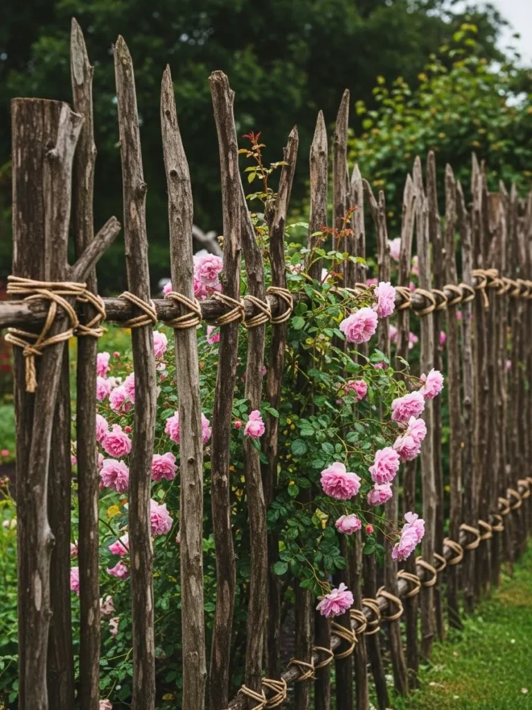 Uneven branches are tied together with natural twine to form a fence that feels completely handmade. Pink climbing roses weave through the gaps and soften the rough texture. Nothing looks straight or polished which adds to the charm.