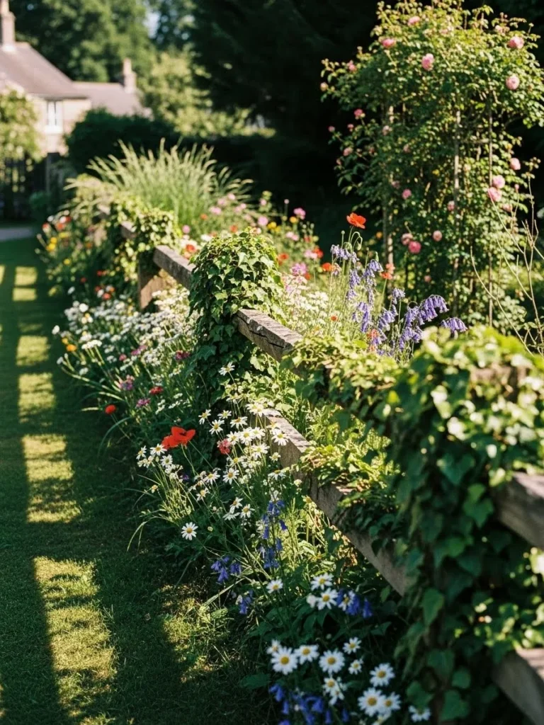 This fence almost disappears behind layers of greenery and blooming flowers. Vines trail naturally along the boards while colorful blossoms spill over the edges in a slightly untamed way. It feels more like a garden boundary shaped by nature than a structured fence line.