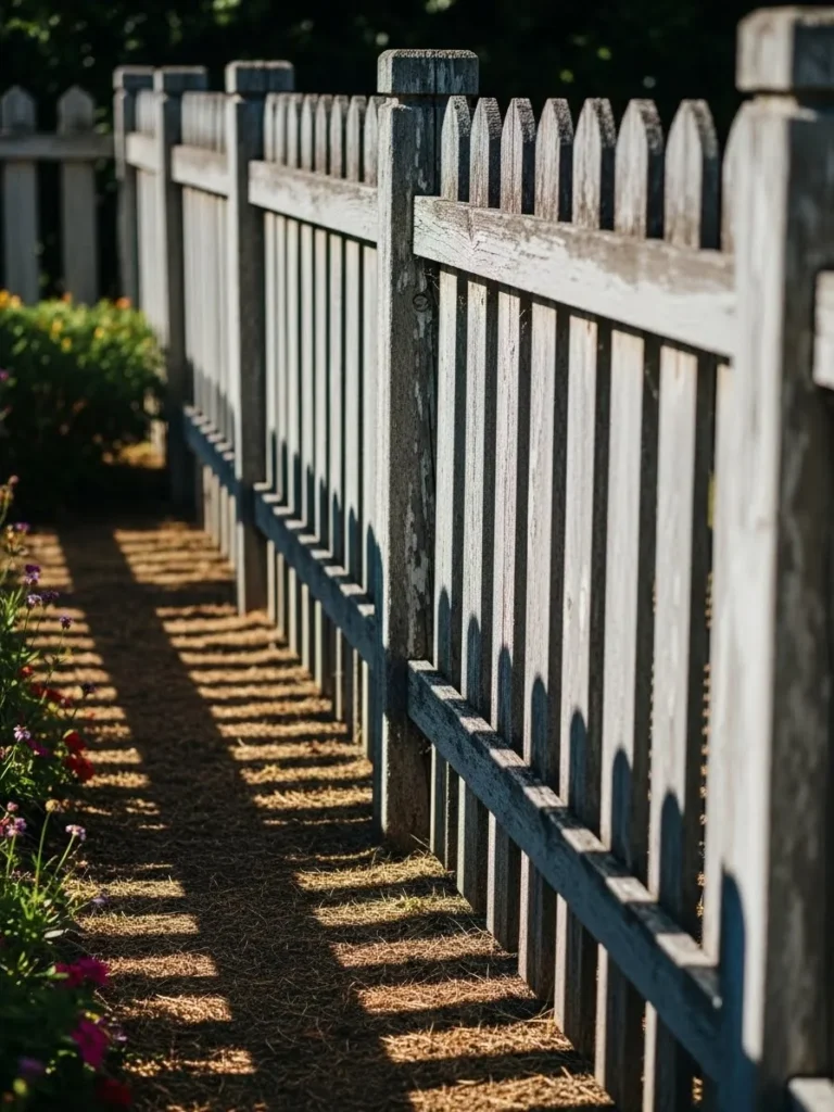 A pale gray picket fence lines a narrow path with sunlight casting long shadows across the ground. The paint has a slightly aged finish that adds warmth to the clean lines. Everything feels calm and orderly without feeling stiff.
