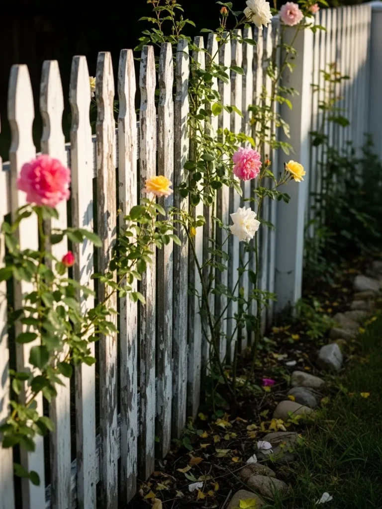 A narrow white picket fence is lined with blooming roses and small garden stones along the base. The flowers peek through the slats and add soft pops of color. The fence feels delicate but still purposeful.