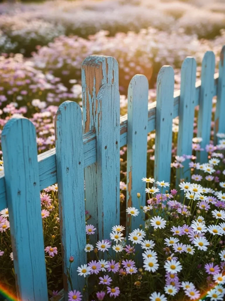 A classic picket fence gets a cottagecore twist with a soft blue paint finish and tiny flowers growing along the base. The paint looks gently worn and sun kissed rather than perfect. Surrounding daisies make the whole scene feel playful and sweet.
