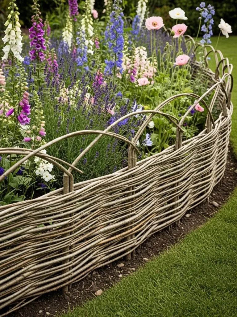 This fence is made from woven natural branches that curve gently along the edge of the lawn. The organic shape and earthy tones blend seamlessly with the surrounding flowers. Nothing about it feels rigid or overly planned.