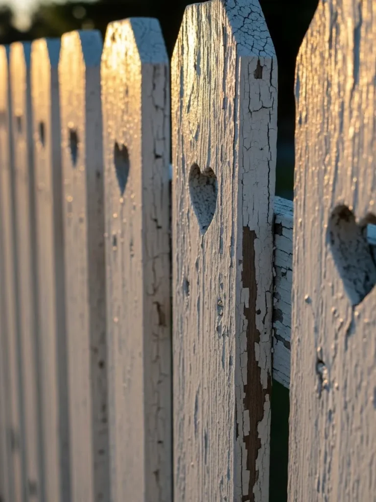 Simple wooden boards are softened with small heart shaped cutouts near the top. The wood looks lightly weathered with a pale finish that catches warm sunlight. Each board feels slightly different which adds even more charm.
