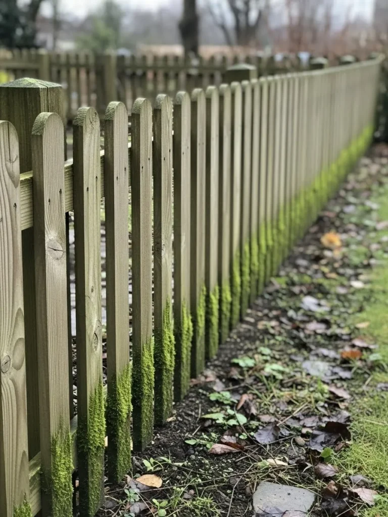 This narrow picket fence runs along a quiet path with soft green moss climbing up the lower edges. The muted wood tone blends into the surroundings and feels gently aged rather than worn out. Fallen leaves and damp earth around the base add to that woodland cottage mood.
