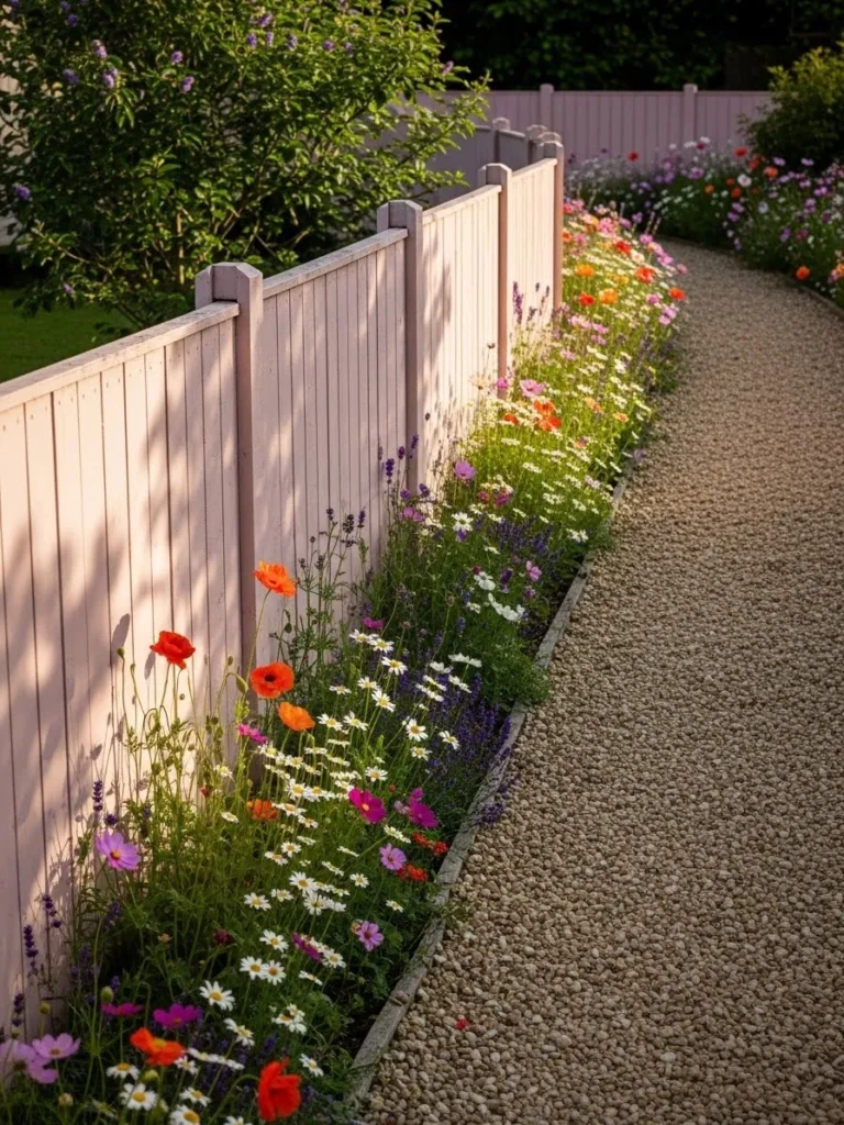 A pale blush fence lines a winding garden path with colorful flowers tucked closely along the base. The soft paint color feels warm and inviting without standing out too much. The flowers add movement and charm as they spill slightly into the walkway.