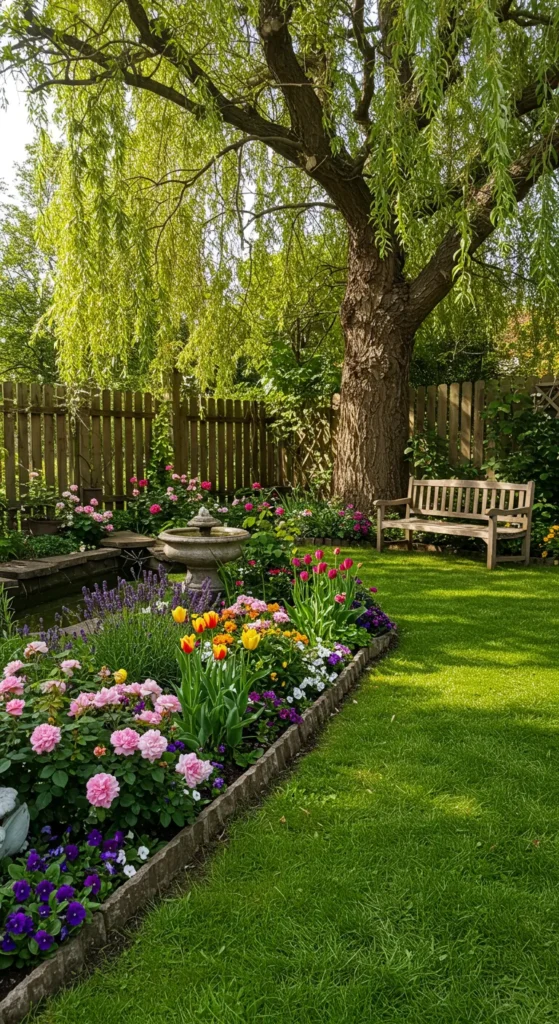 This tranquil garden oasis features a charming water fountain surrounded by lush flower beds, including colorful roses, tulips, and pansies. The garden is shaded by a large weeping willow tree, creating the perfect spot for a wooden bench to sit and enjoy the peaceful surroundings. The neatly landscaped garden path, made of soft bricks, leads you to the focal point of the space, with the vibrant blooms offering a burst of color. The entire scene is enclosed by a simple wooden fence, ensuring privacy and adding a rustic country feel to the space.