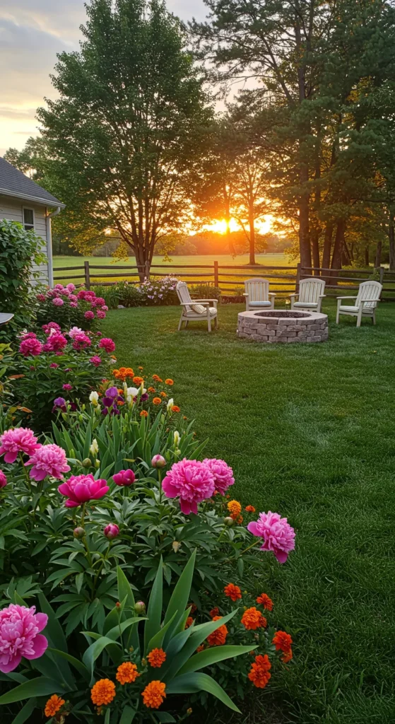 This stunning garden area features a beautiful stone fire pit surrounded by comfortable chairs, perfect for cozy evenings spent outdoors. The vibrant flower beds, overflowing with peonies, marigolds, and other colorful blooms, create a striking contrast against the lush green lawn. The setting sun adds a magical touch, casting a warm glow over the space and making it feel like a perfect retreat. The rustic wooden fence frames the view, creating a peaceful and private ambiance that enhances the overall country charm.
