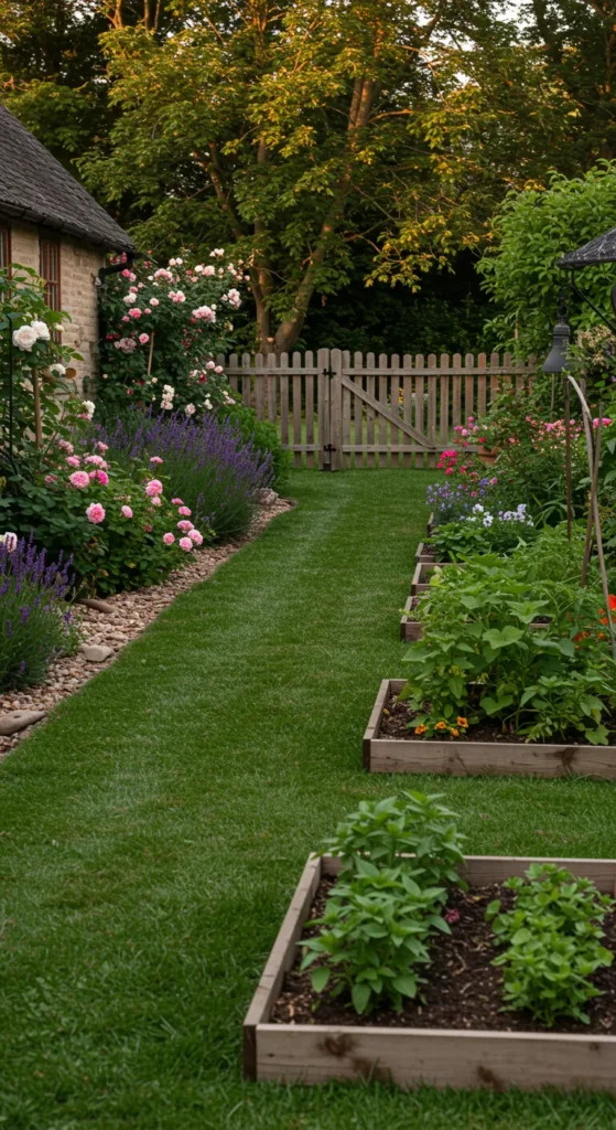 I absolutely love the combination of colors and textures in this design. The vibrant flowers, especially the soft pinks of the roses and the purple hues of the lavender, create a peaceful and inviting atmosphere. The raised beds not only add structure but also make the garden feel like it’s been thoughtfully planned for both beauty and function. This is the kind of space that would make any gardener’s heart skip a beat, and I can just imagine enjoying a quiet afternoon here, surrounded by the beauty of nature and the fragrance of flowers in full bloom. It’s a perfect blend of country charm and practical design.