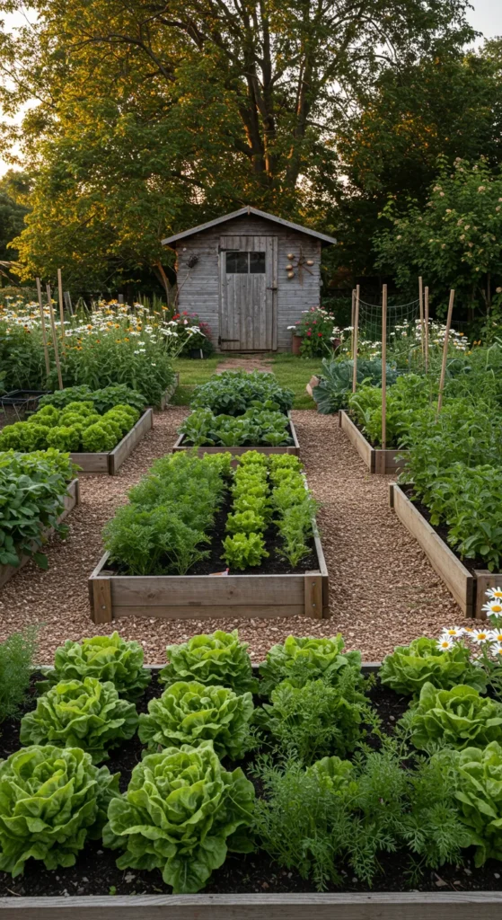 This beautiful country garden features well-organized raised beds brimming with fresh produce, including leafy greens and carrots. The gravel pathway between the beds leads to a quaint wooden shed, nestled in the background, creating a perfect rustic backdrop for the lush greenery. The vibrant colors of the flowers surrounding the garden beds, including daisies and marigolds, add an extra layer of charm to the space. The entire scene is bordered by trees, creating a peaceful and private atmosphere, ideal for both gardening and relaxing.