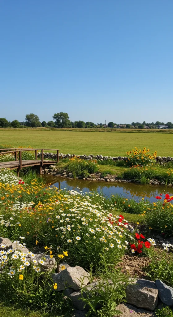 This enchanting garden scene features a lovely wooden bridge arching over a peaceful pond, surrounded by vibrant flower beds. The water reflects the bright colors of the blooms—daisies, sunflowers, and poppies—creating a serene and picturesque atmosphere. The stone border of the pond adds rustic charm, while the lush green fields in the background provide a sense of openness and tranquility. The clear blue sky and natural lighting further enhance the beauty of this country retreat.