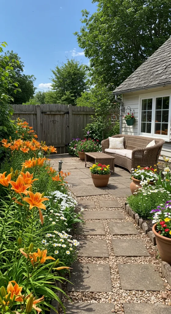 I absolutely love how this design combines both comfort and nature. The combination of the inviting seating area with the colorful flowers really makes it feel like a personal sanctuary. The contrast of the orange lilies against the fresh green plants creates such a refreshing vibe, and I can just imagine enjoying a sunny afternoon here, reading or chatting with friends. The whole space feels so effortlessly stylish, yet completely cozy—a perfect mix of relaxation and beauty. It’s the kind of patio you’d want to spend hours in, basking in the sunshine and the peaceful surroundings.