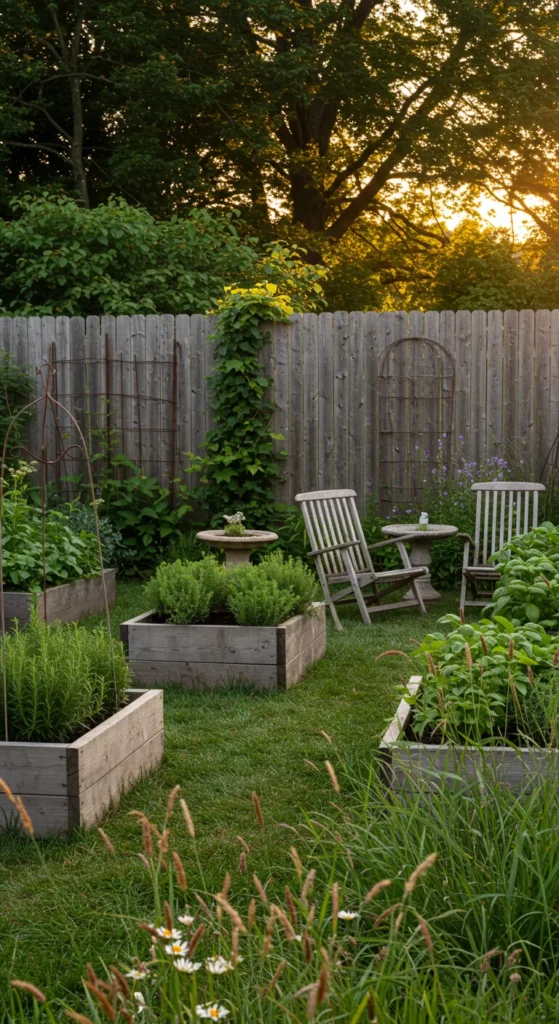 This charming backyard is a haven for gardening lovers with raised wooden planters brimming with fresh herbs and vegetables. Two wooden chairs, placed thoughtfully by a quaint stone table, create an inviting spot to relax and enjoy the tranquil beauty of this garden. The lush greenery contrasts beautifully with the soft sunlight filtering through the trees, casting a warm glow over the space. The simple wooden fence in the background adds a rustic touch, while the climbing vines bring a sense of natural growth and coziness.