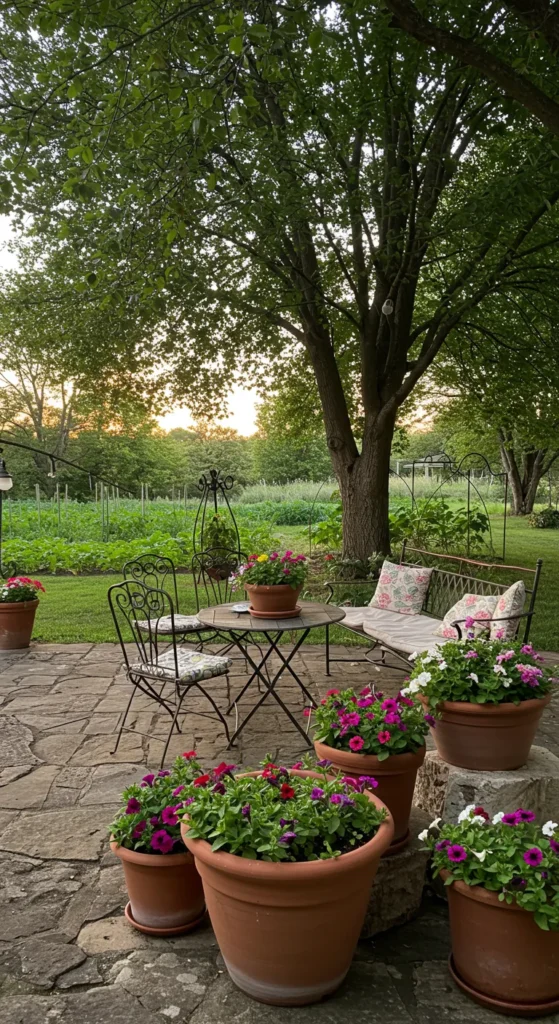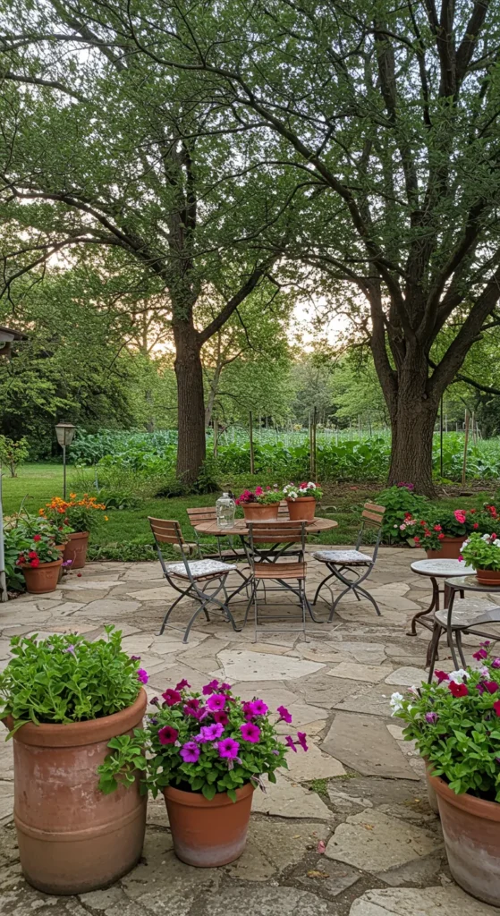 This delightful patio area is tucked away in the perfect corner of the garden, offering a serene escape with its stone-paved floor and comfortable, rustic furniture. The setting sun casts a warm glow over the space, highlighting the colorful flowerpots that surround the table and chairs. A few lush trees offer shade, and the rich greenery of the garden continues to stretch far into the background, creating a peaceful ambiance. The rustic wooden fence adds a charming country touch, while the vibrant flowers—especially the petunias—bring a burst of color and freshness.