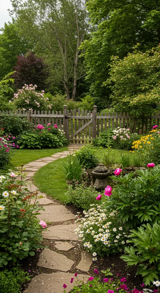 I absolutely adore the way the stone path guides you through the garden, almost like a secret escape. The mix of flowers—so perfectly arranged—brings so much life to the scene. The gate adds that perfect country charm, and the towering trees complete the idyllic, peaceful vibe. This design feels like a perfect little haven, one that I would love to spend hours in, enjoying the fresh air and the beauty all around. It just exudes that cozy, rustic charm we all crave for our dream country home.