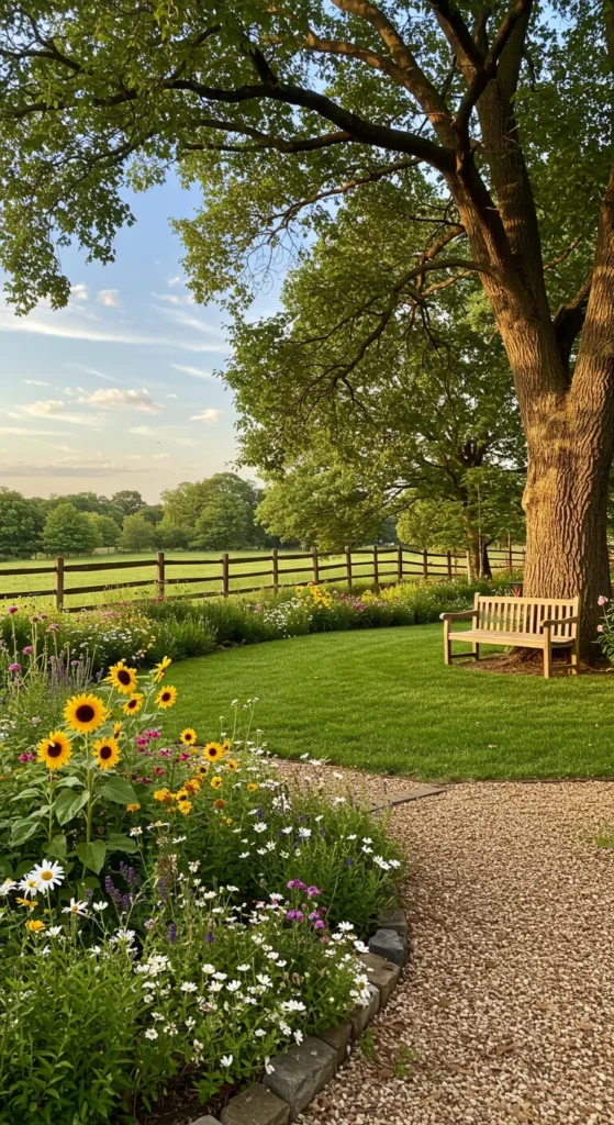 I absolutely love how this garden captures the essence of country living! The flowers are so vibrant, and the bench under the tree looks like the perfect spot to spend a lazy afternoon reading or sipping a cup of tea. The combination of the soft gravel path and the colorful blooms creates such a warm, welcoming atmosphere, making this garden feel like a perfect retreat from the hustle and bustle of daily life. It’s the kind of space that feels timeless and comforting, and I can just imagine myself relaxing here for hours, enjoying nature at its finest.
