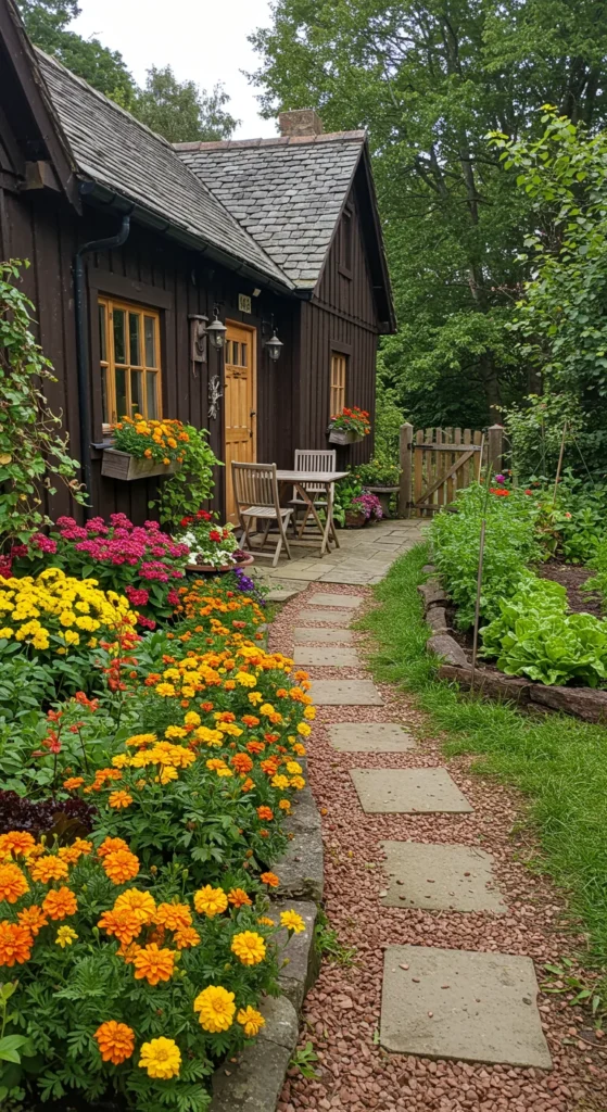 This sweet little cottage, painted in a warm brown hue, sits perfectly amidst a vibrant garden. The charming stone pathway leads to the front door, flanked by lush greenery and colorful flowers, including bright marigolds and cheerful pinks. The quaint wooden seating area by the door offers a cozy spot to enjoy the surrounding beauty, while the soft stone path creates a welcoming atmosphere. With its rustic charm and stunning flower-filled garden, the house feels both inviting and peaceful, like something straight out of a fairytale.