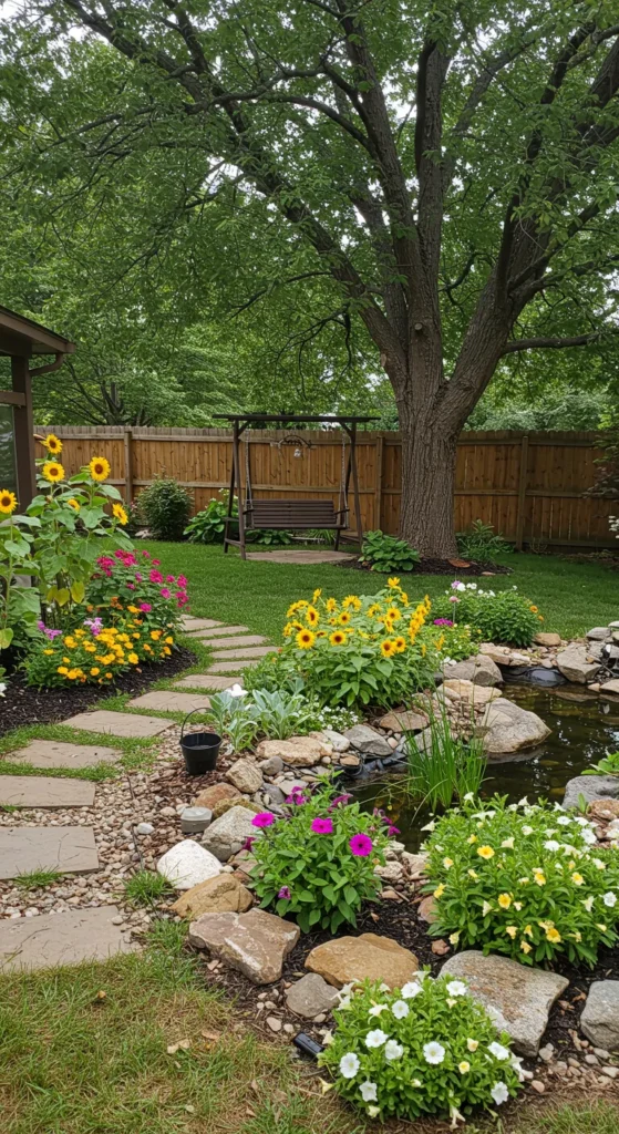 This beautiful backyard features a serene scene with a relaxing swing nestled beneath a large tree, inviting you to unwind and enjoy the tranquility. A gently winding stone path leads through vibrant flower beds filled with sunflowers, petunias, and colorful blooms. The path circles a charming pond, surrounded by smooth stones, where the soft sound of water adds to the peaceful atmosphere. The wooden fence in the background provides privacy and a rustic feel, while the lush greenery completes the perfect country landscape.