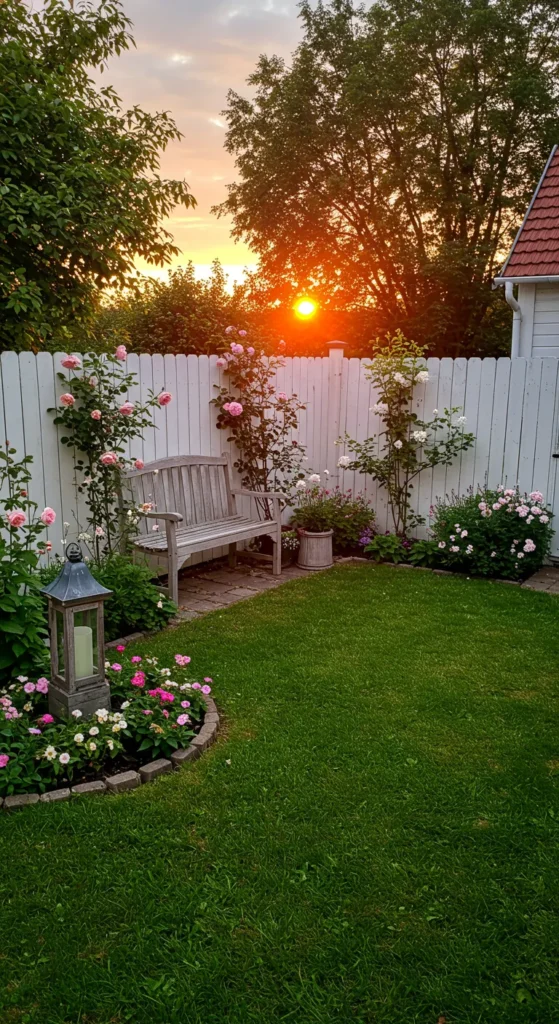 I can’t help but love how cozy and inviting this space feels, especially with that gorgeous sunset lighting up the sky. The combination of the delicate rose-covered fence and the flower-filled garden makes it feel like a secret haven, perfect for relaxing with a book or enjoying a quiet evening. The soft glow from the lantern adds such a lovely, welcoming touch to this already magical setting. Honestly, it’s the kind of spot you dream about having in your own backyard!