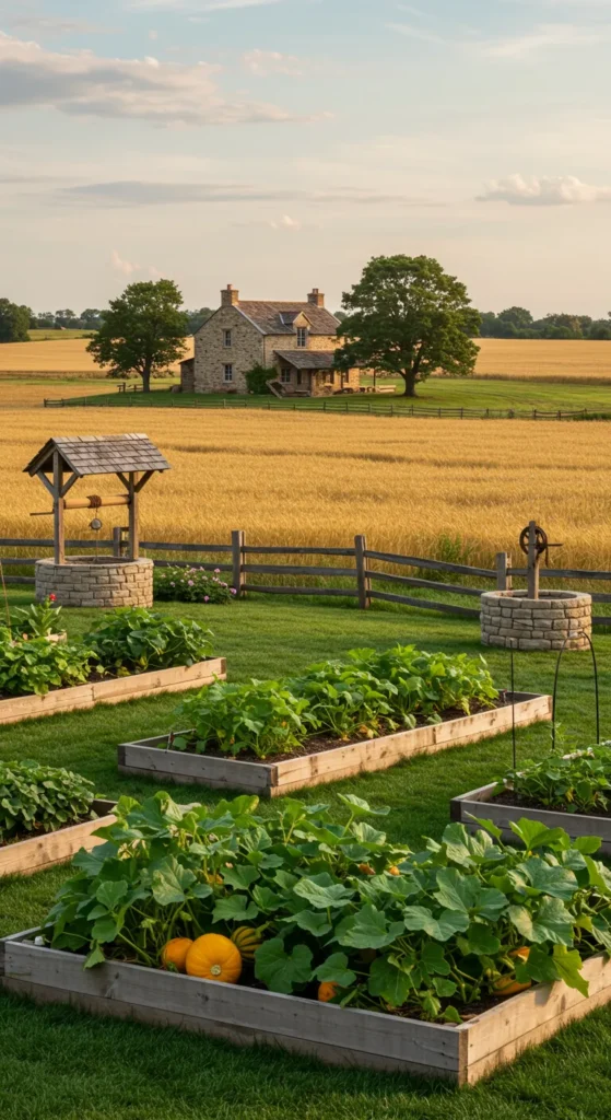 This stunning farmhouse sits gracefully on a sprawling field, offering picturesque views of the surrounding countryside. The stone home features a charming front porch with a welcoming, rustic vibe, while the garden is designed with raised beds perfect for vegetable gardening. A stone well and rustic wooden fence add to the country charm, while pumpkins and lush greenery thrive in the garden, creating a peaceful, farm-fresh atmosphere.