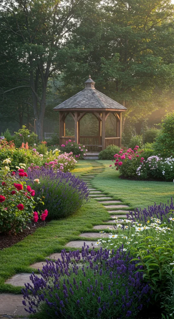 I absolutely adore how this design effortlessly combines beauty and relaxation. The lush garden paths, lined with flowers in full bloom, draw you in, and the gazebo feels like an invitation to sit and stay a while. The soft lavender and vibrant roses create the most beautiful contrast, while the warm sunlight gives the whole scene a golden glow. It’s the kind of space that makes you feel calm, collected, and totally at peace, and I can easily picture myself enjoying a cozy afternoon here, surrounded by nature’s finest.