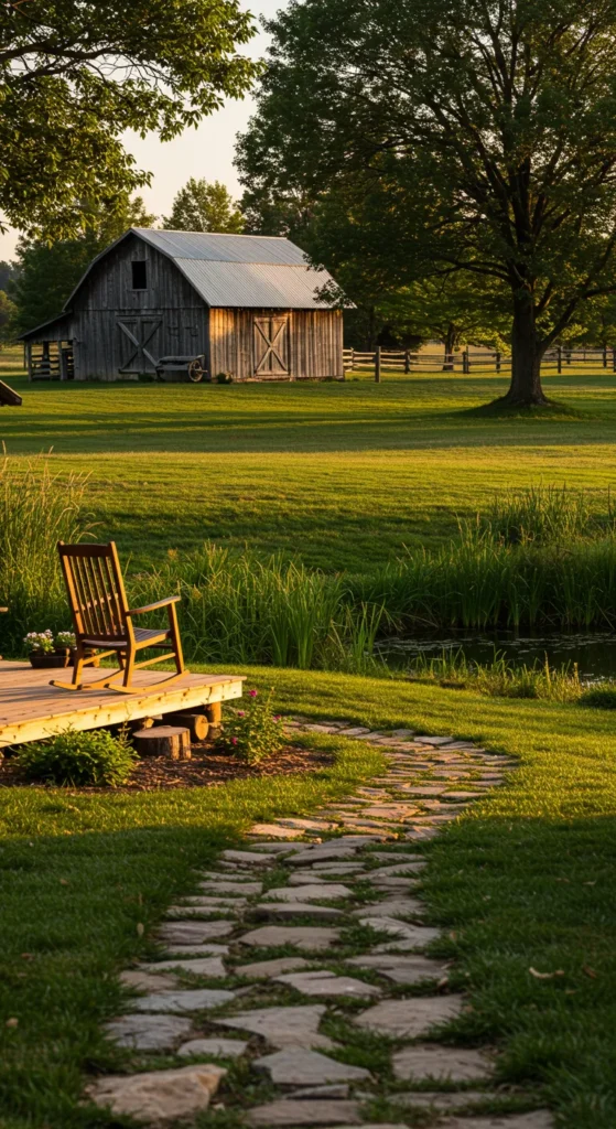 This stunning country retreat captures the essence of rustic living with a charming stone barn in the background. The large grassy lawn stretches out in every direction, bordered by a classic wooden fence, while a serene pond with soft grasses sits nearby. A stone pathway leads toward a wooden deck with a single rocking chair, offering a perfect spot to relax and enjoy the beauty of the wide-open space. The barn adds a sense of timelessness to the property, enhancing its farm-fresh appeal.