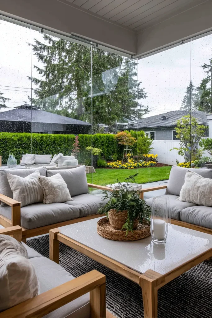 Talk about blurring the lines between indoors and out this design is sleek, sophisticated, and unbelievably all-weather ready. This covered patio is completely enclosed on two sides by floor-to-ceiling glass walls that protect the furniture from rain and wind while still giving you an unobstructed view of that lovely, manicured lawn. The furniture is minimalist and modern, featuring light wood frames and soft gray cushions, keeping the focus on the beautiful garden outside. The roof is solid, offering total shade and making this feel like a truly cozy, sheltered sunroom.