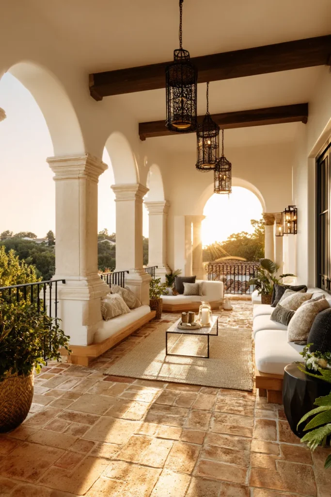 This covered balcony is a stunning example of Mediterranean Revival architecture, making it feel like a romantic Spanish villa. The solid roof is supported by beautiful, thick stucco arches and columns, offering substantial shade and protection while creating a gorgeous architectural feature. The terracotta tile floor adds a classic, rustic warmth that contrasts perfectly with the crisp white furniture. The whole look is dramatically finished with those stunning, intricate black wrought-iron lanterns hanging from the ceiling.