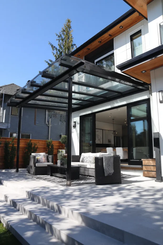 I think this glass roof is just the coolest idea because it’s completely practical but looks so chic and high-end. It’s like having an invisible shield over your patio, and I love that it lets all the sunshine through to keep the space bright. This is the ultimate design for someone who has a modern home and wants their patio to look just as sleek and polished as their interiors. It’s definitely a showstopper and makes the backyard feel like a sophisticated lounge.
