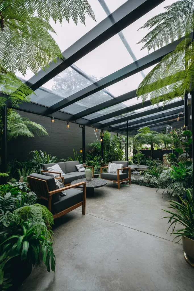 This covered patio is a lush, green oasis that feels like stepping into a private greenhouse jungle. The roof is a clear glass panel system supported by a dark, thin metal frame, which gives you full rain protection while making the most of the sunlight for all those amazing plants. The dark paint on the back wall and the gray concrete floor create a chic, moody backdrop that allows the vibrant greens of the ferns and tropical plants to absolutely pop. The simple, modern furniture blends seamlessly into the stunning botanical setting.