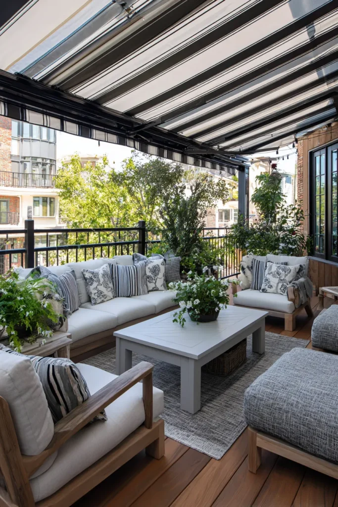 This charming covered balcony is a fantastic solution for city living proving you don’t need a huge backyard for a functional patio. The striped retractable awning provides flexible, full coverage when needed and adds a playful, classic cabana style with its black-and-white pattern. The furniture is chic and comfortable, with white cushions, teak wood frames, and fun black-and-white patterned pillows that echo the awning. Plenty of potted greenery softens the urban backdrop and adds a touch of freshness.