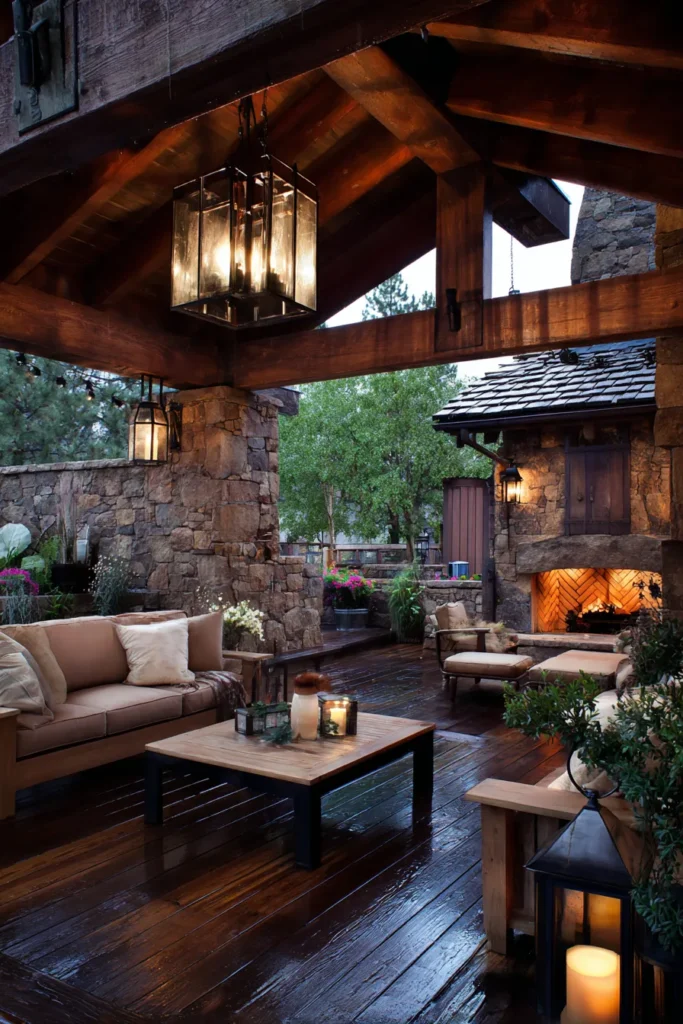 This patio is a cozy mountain lodge dream come to life with a stunning combination of rich textures and warm materials. The covered area boasts a thick, dramatic wood beam ceiling that gives the space incredible height and a rustic feel. The walls and support columns are built with beautiful, natural fieldstone, which perfectly complements the gorgeous outdoor fireplace. The flooring is a deep, warm-toned wood plank deck, and the lighting is a mix of carriage lanterns and large, rustic-chic pendants that cast a lovely glow on the entire scene.