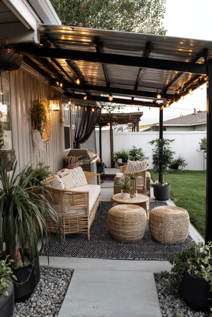 This is a fantastic example of a stylish covered patio that uses creative and cost-effective materials to achieve a great look. The covered roof is simple corrugated metal with an exposed black frame, giving it a cool, slightly industrial and modern edge. The bright white siding of the house and the clean lines contrast perfectly with the warm, earthy texture of the rattan furniture and round storage ottomans. The black-and-white patterned rug anchors the space, and the string lights add that essential cozy sparkle.