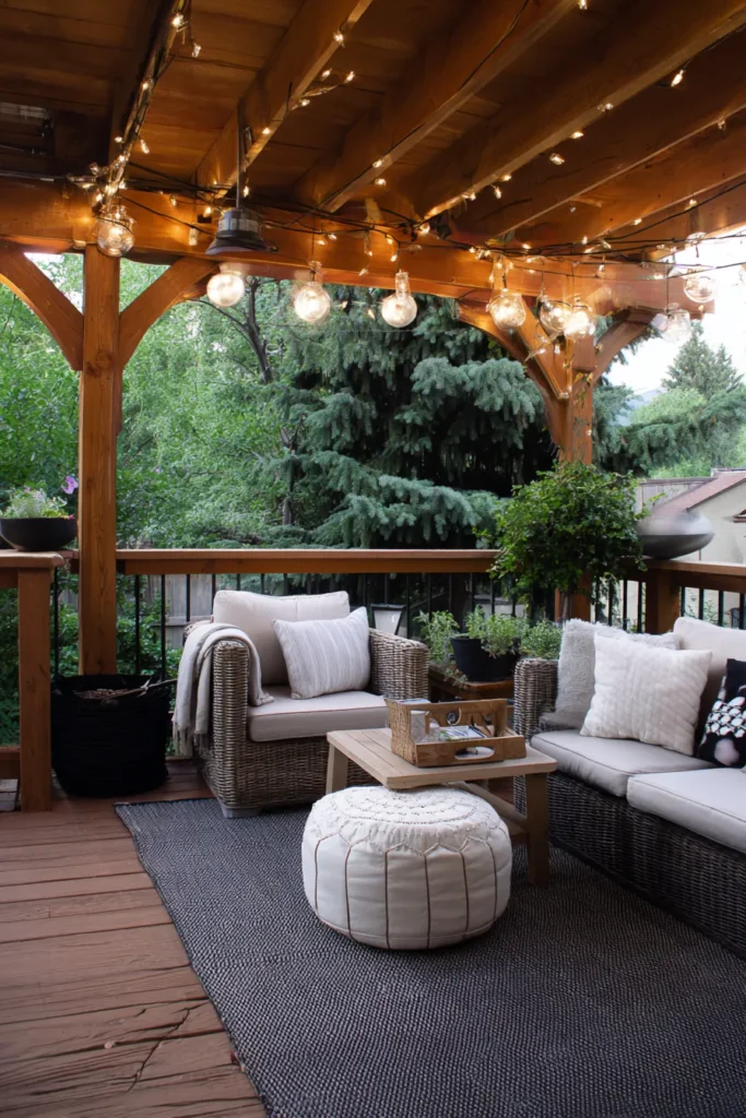 This covered deck is the ultimate cozy hideaway, making great use of a simple pergola structure and amazing lighting. The covered roof features widely spaced wooden slats which, while not totally solid, still offer shade and a place to hang lights, and it’s built on a beautiful wooden deck. The true magic is in the abundance of bistro lights and fairy lights strung across the beams, creating a warm, festive canopy. The deep gray wicker furniture and soft cream cushions are incredibly inviting, perfect for sinking into.