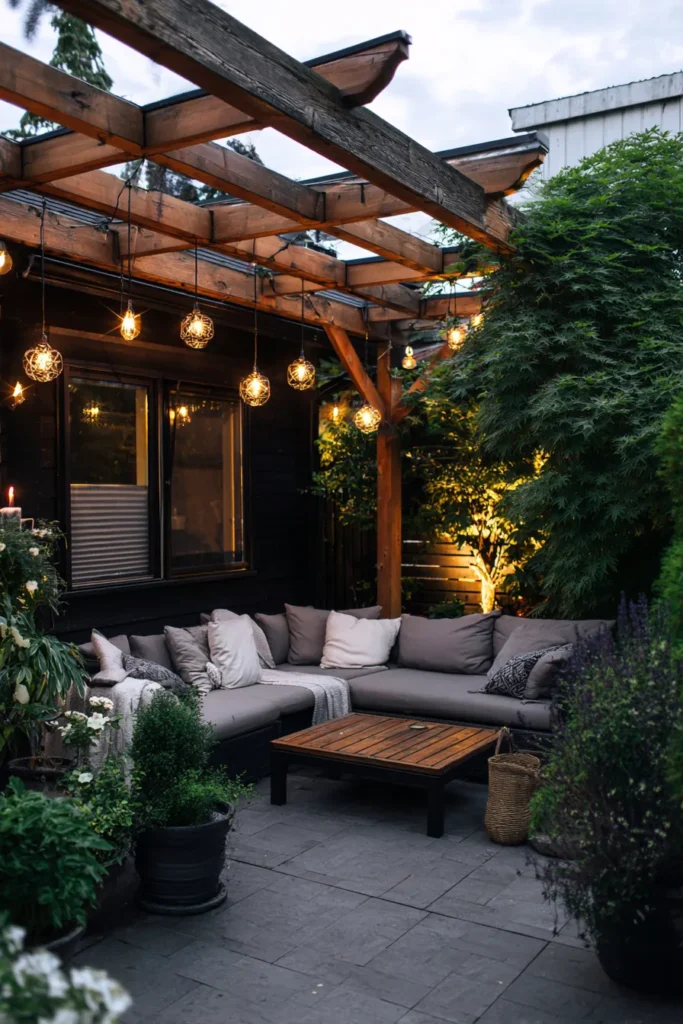 This covered space has a wonderfully moody and romantic atmosphere, feeling like a secret garden retreat after dark. The wooden pergola structure provides the roof, which is adorned with strands of simple, glowing globe lights that illuminate the space beautifully against the dark background. The house siding is painted black, which makes the lush greenery and the warm wood of the pergola really stand out dramatically. The furniture is a comfy gray sectional sofa that makes the whole corner feel private and snug.